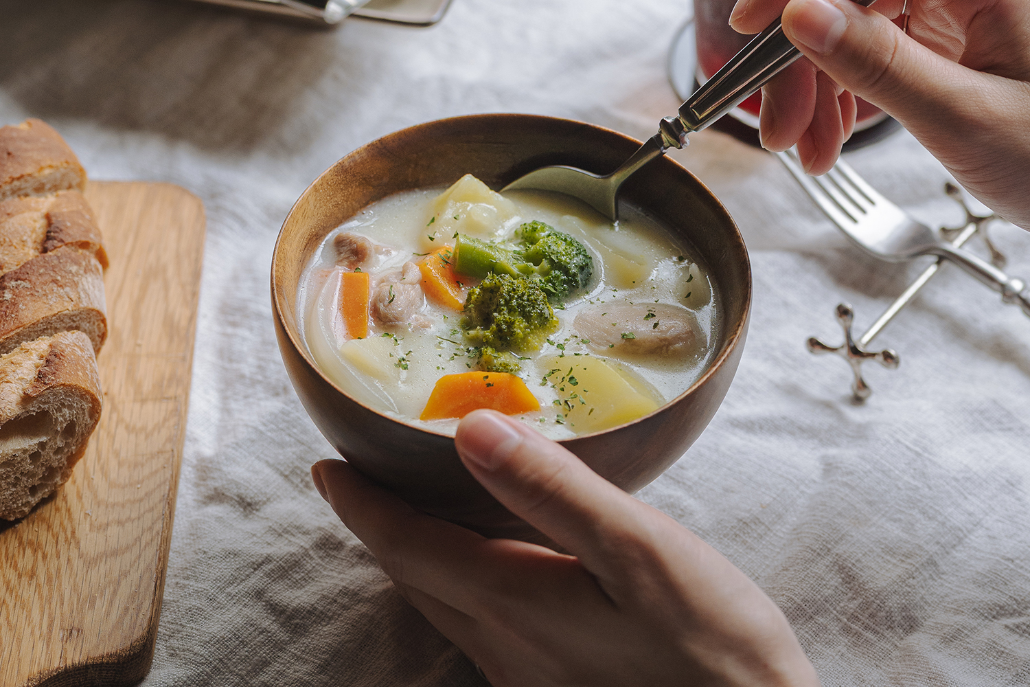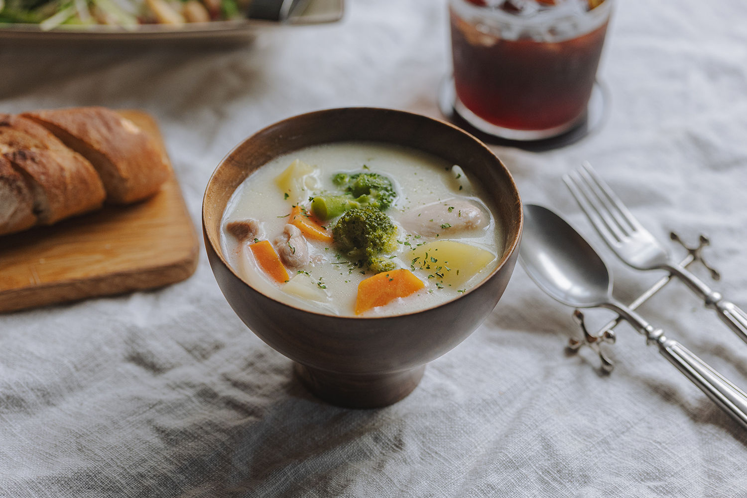 白いシチューをより柔らかに引き立て、野菜の彩りをより一層鮮やかに映えさせます。